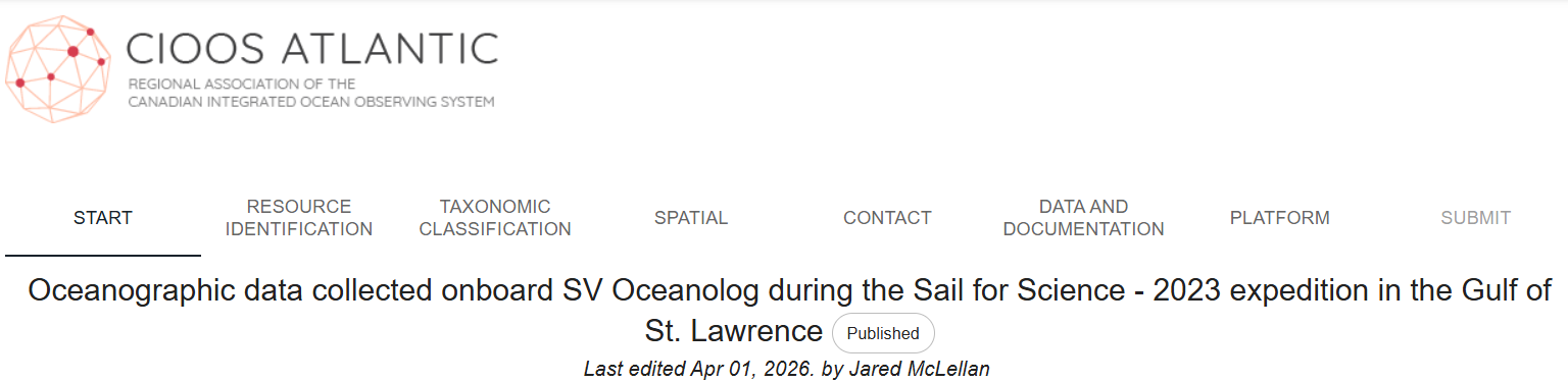 More great news arrived on April 1st (no kidding!). Our data, collected at the beginning of our Sail for Science – 2023 expedition in the Gulf of St. Lawrence, has been assessed and published in the Canadian Integrated Ocean Observing System’s (CIOOS) database. We are thrilled that the results of our work were accepted and published in Canada, the country we are proud citizens of, where we have lived for the past 25 years, where we worked at RBR Ltd., a great company that manufactures oceanographic instruments, and the country under whose flag we collected the oceanographic data aboard SV Oceanolog. Thanks to everyone who participated in the data assessment, especially Jared McLellan . We will continue to share our data and work on presenting data from Bras D’Or Lake and the east coast of Nova Scotia. Stay tuned!