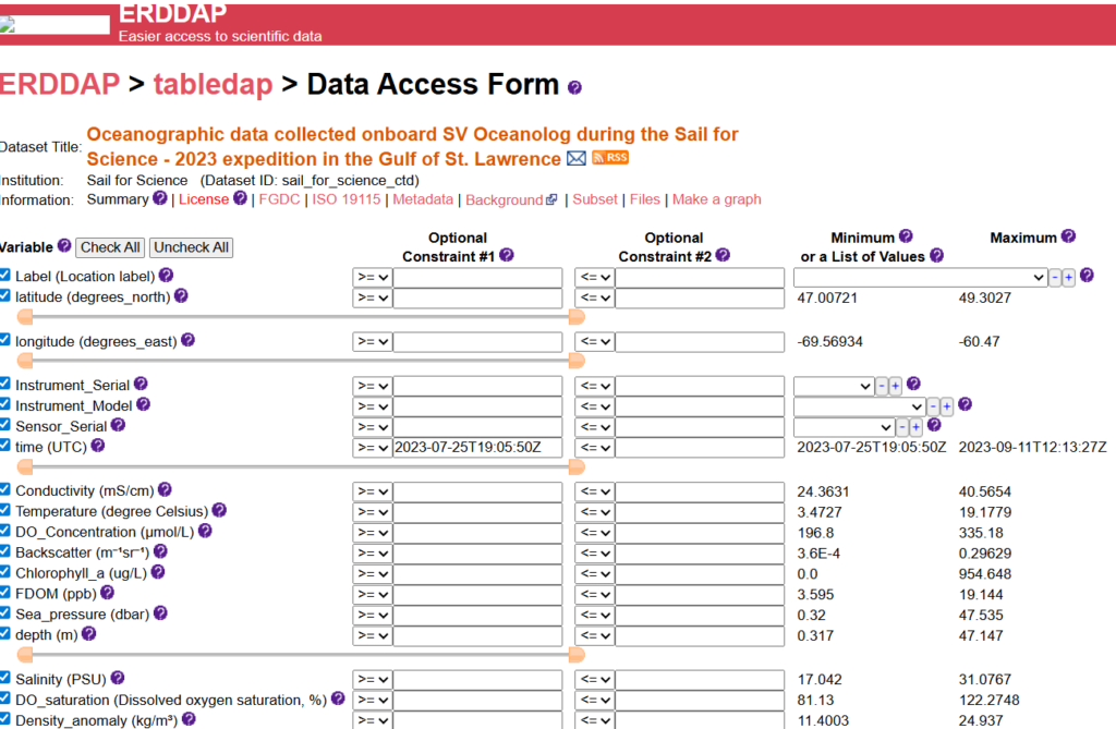 Access to the data through the ERDDAP: https://dev.cioosatlantic.ca/erddap/tabledap/sail_for_science_ctd.html